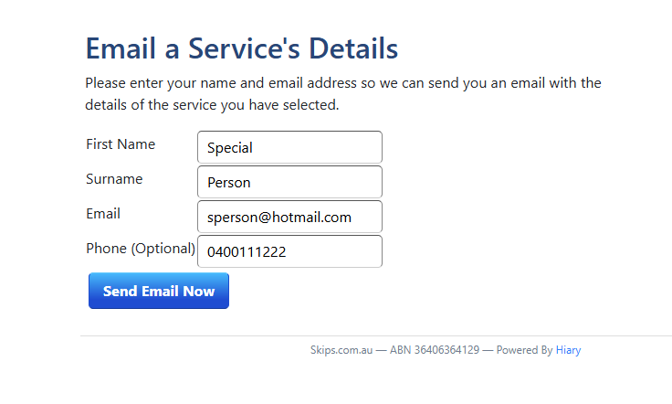 you can email details of the service to yourself or anyone who is seeking information about our services, like family, friends, or colleagues. Click on the Email button and fill in the fields in the dialogue box, then click the button to send. To book the skip bin, click on the button that says Book It.